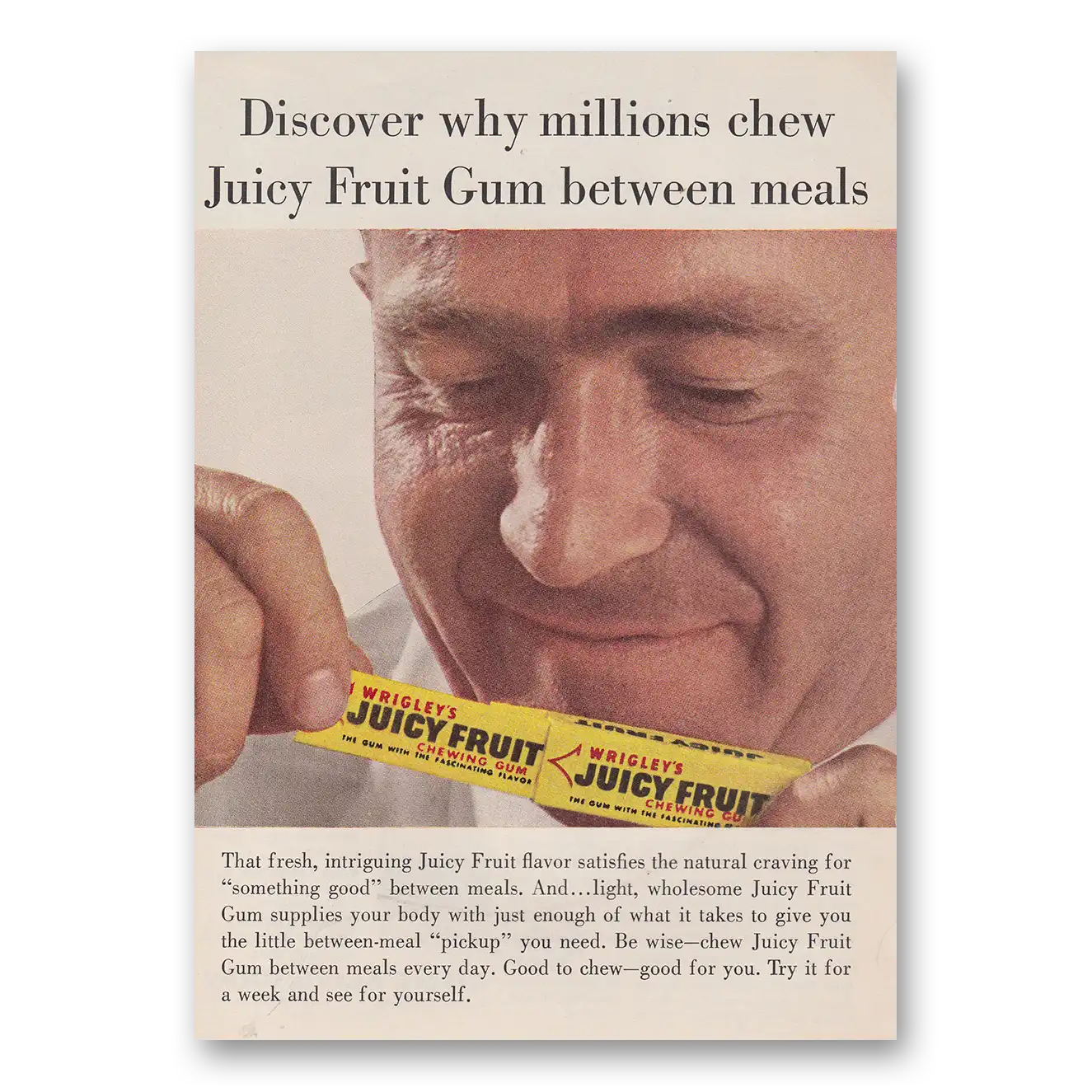 “Millions Chew Juicy Fruit Gum Between Meals”