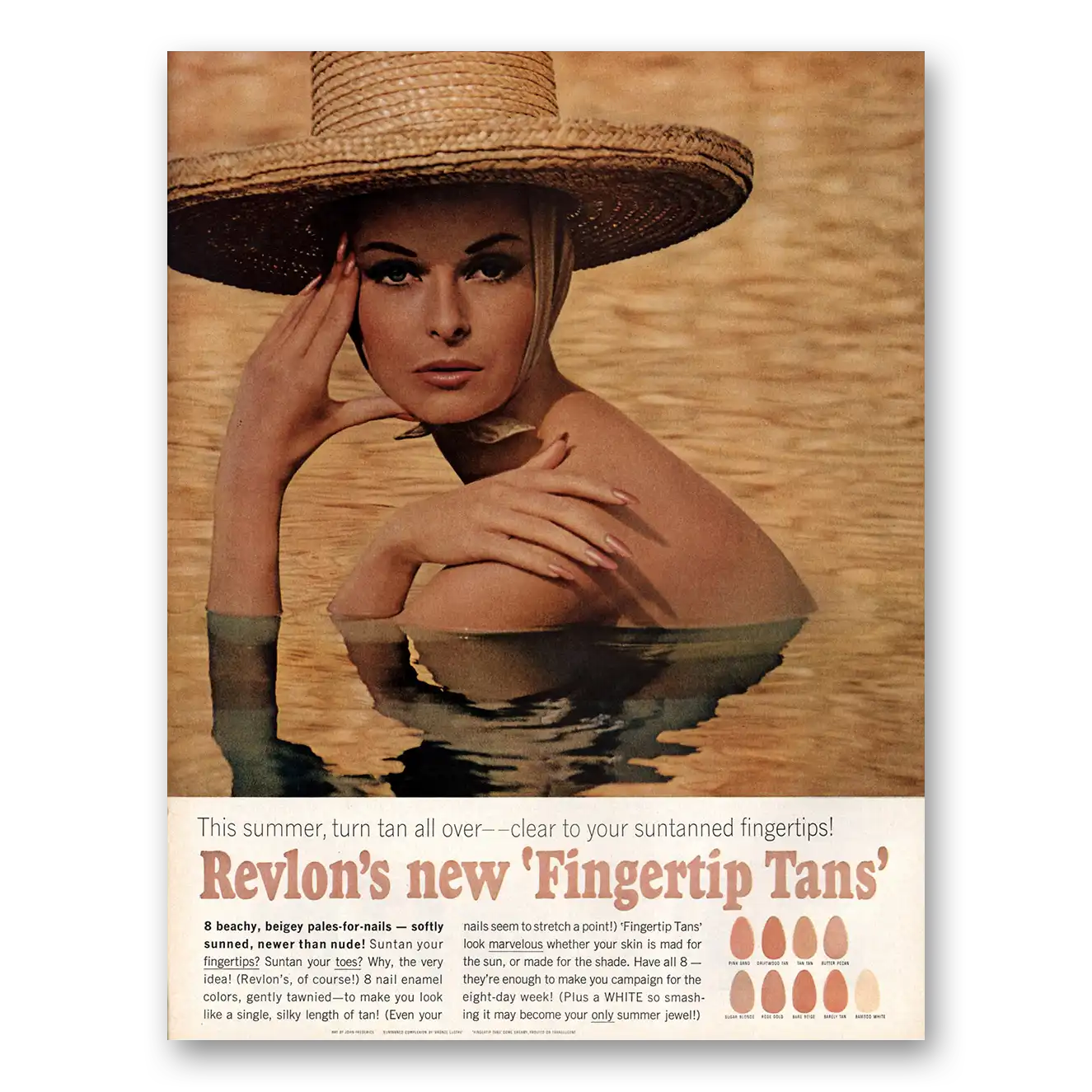 This is an original 1964 Revlon Fingertip Tans Polish print ad published by Revlon.