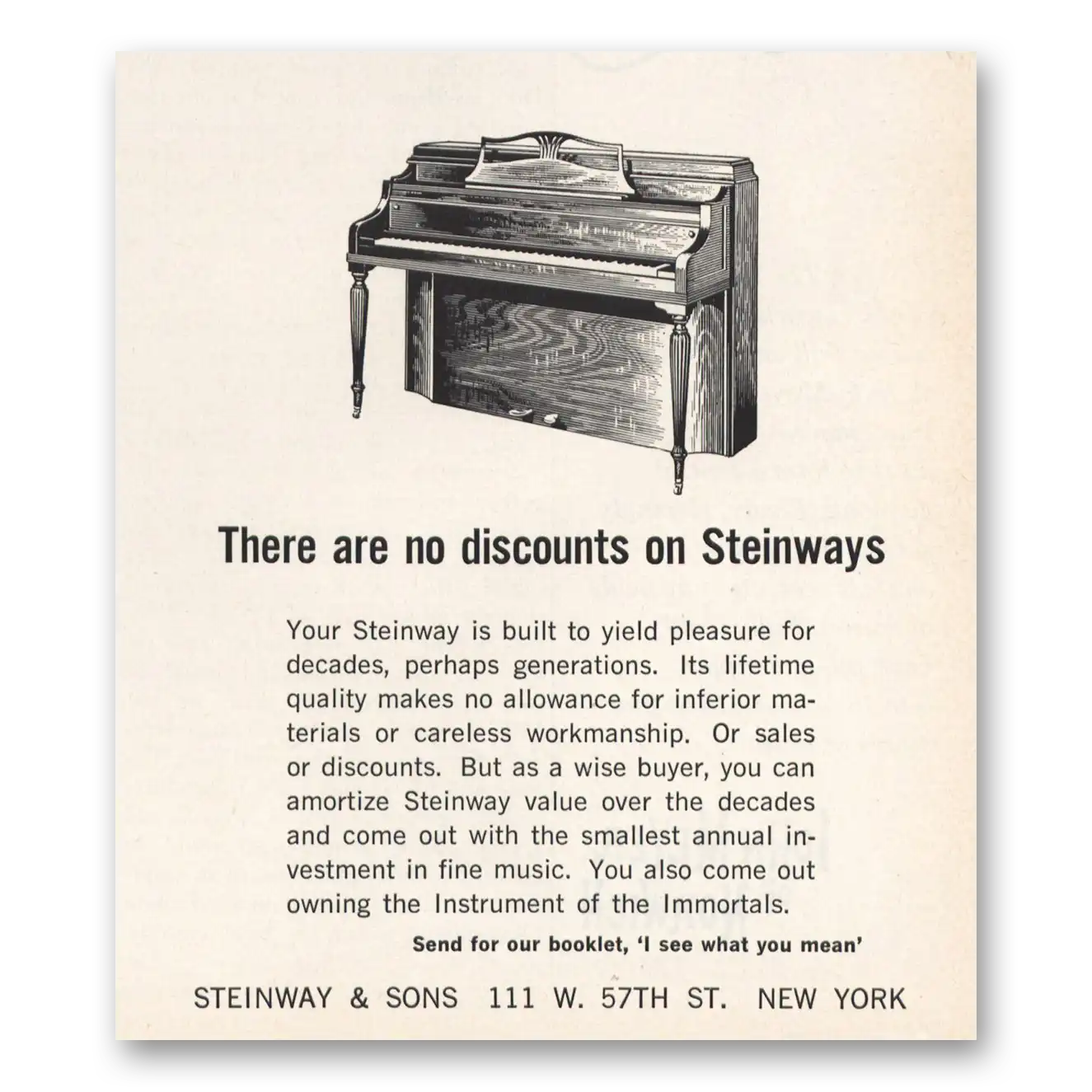 1965 Steinway Piano Print Ad | No Discounts