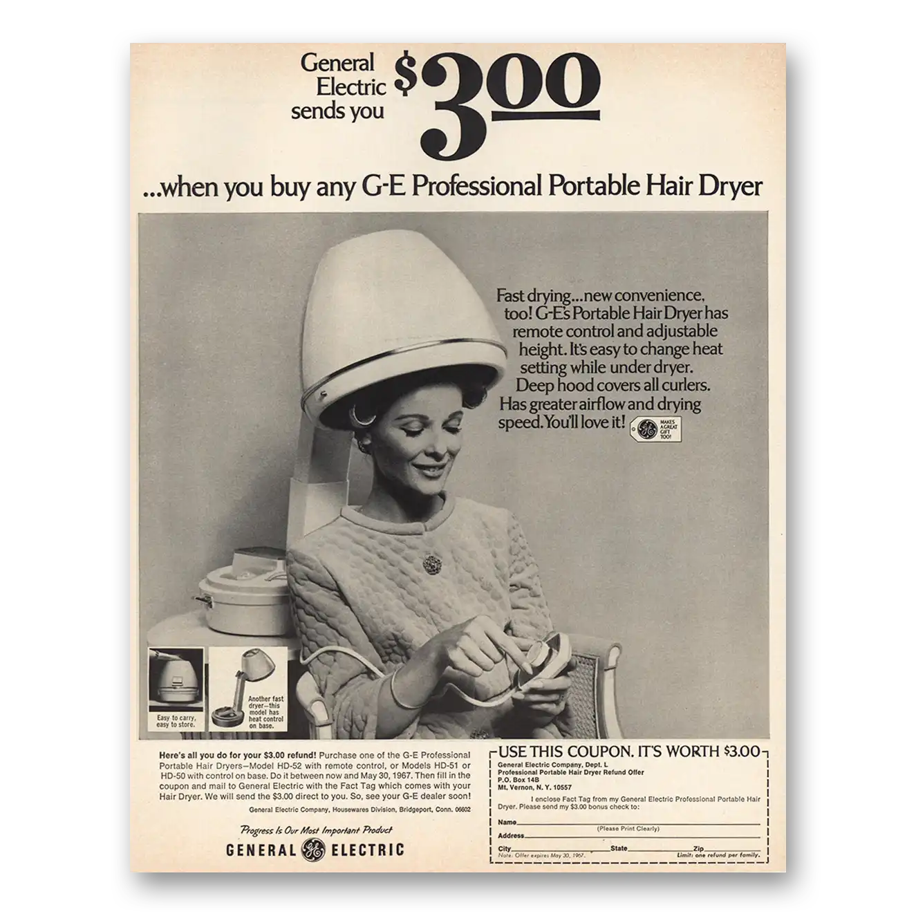 This is an original 1967 GE Professional Portable Hair Dryer print ad published by General Electric.