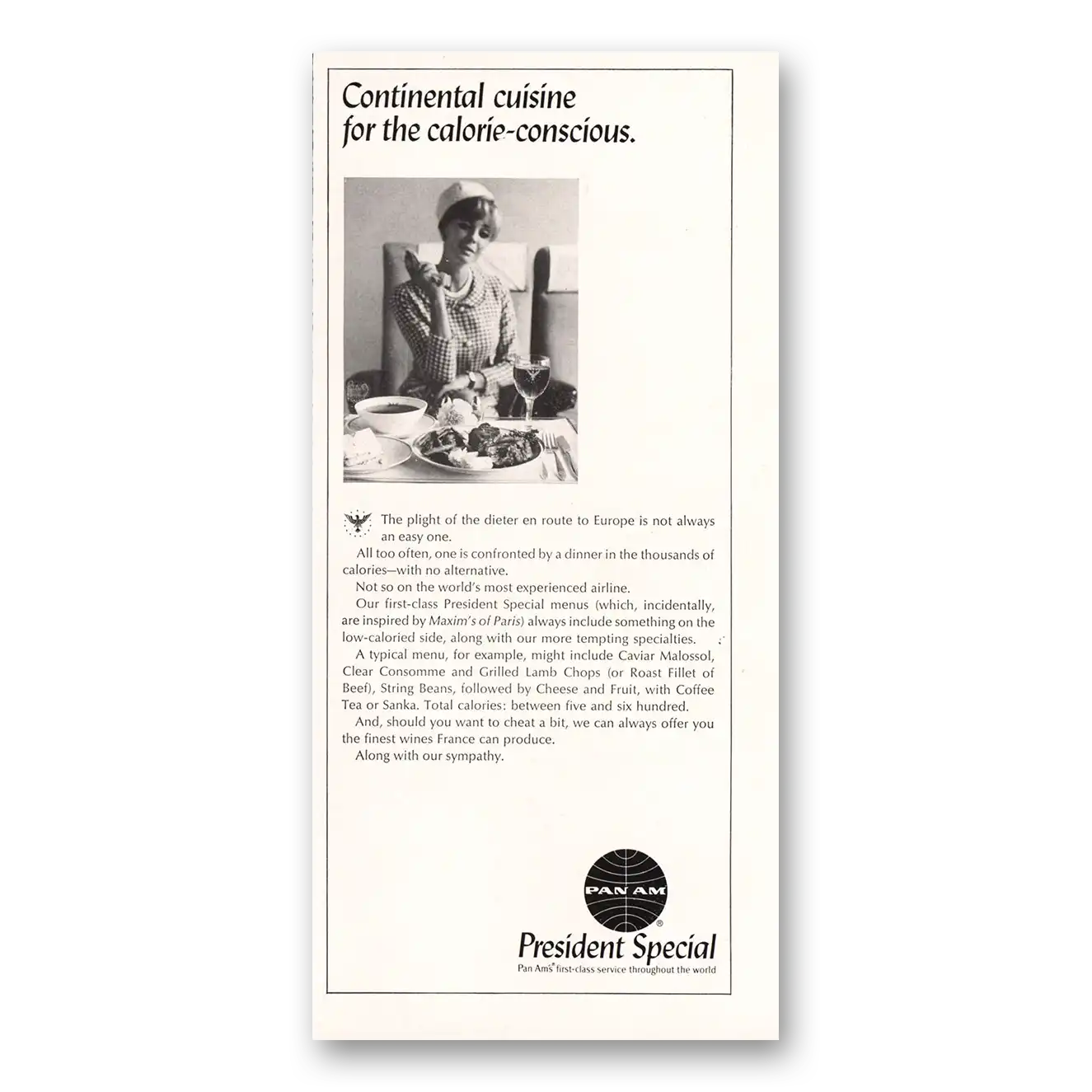 1967 Pan Am Print Ad | Continental Cuisine Diet Conscious