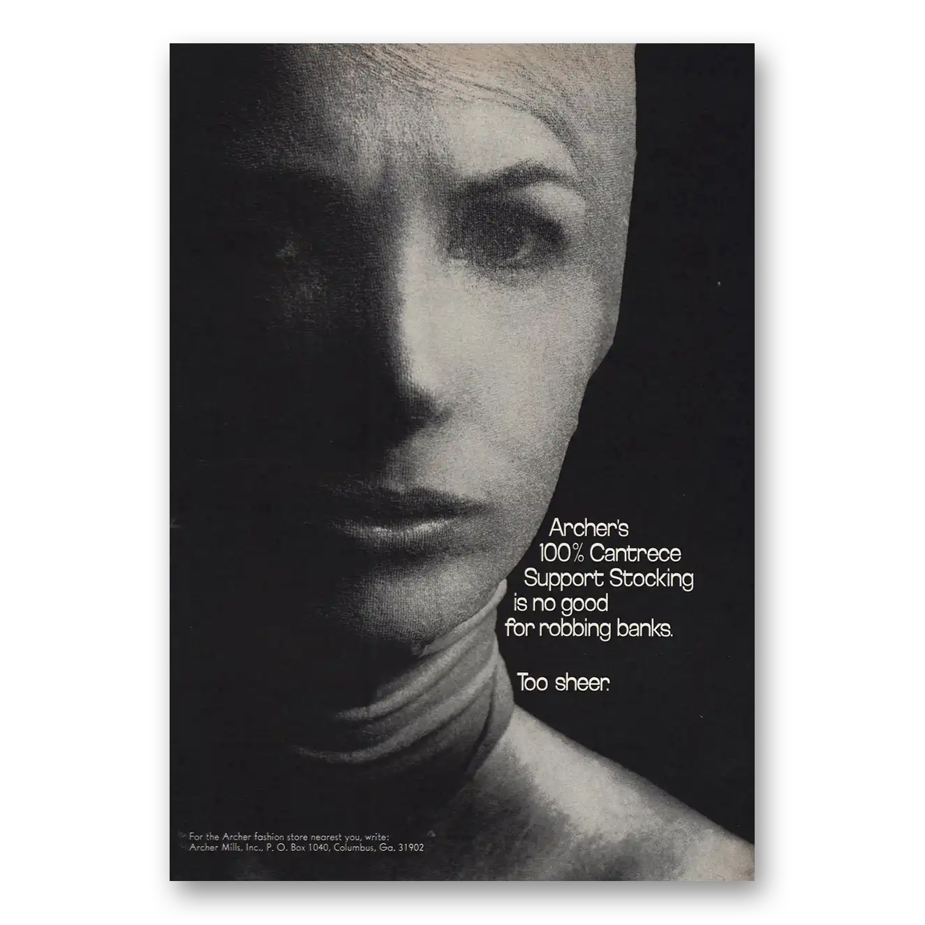 1968 Archer Mills Print Ad | Stocking No Good For Robbing Banks