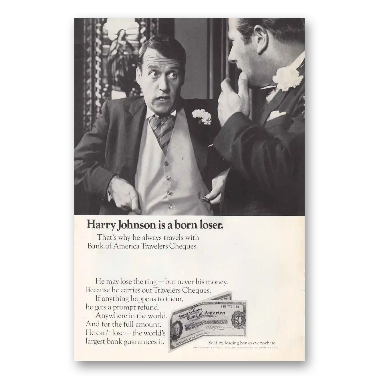 This is an original 1968 Bank of America Travelers Cheques print ad published by Bank of America.