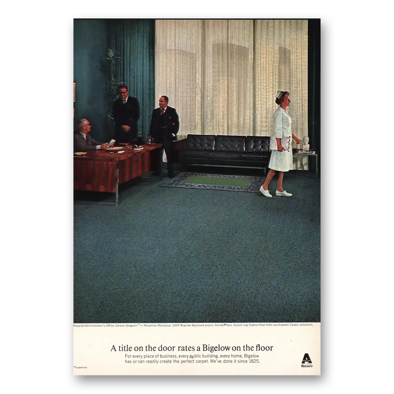 1968 Bigelow Carpet Print Ad | Hospital Administrators Office
