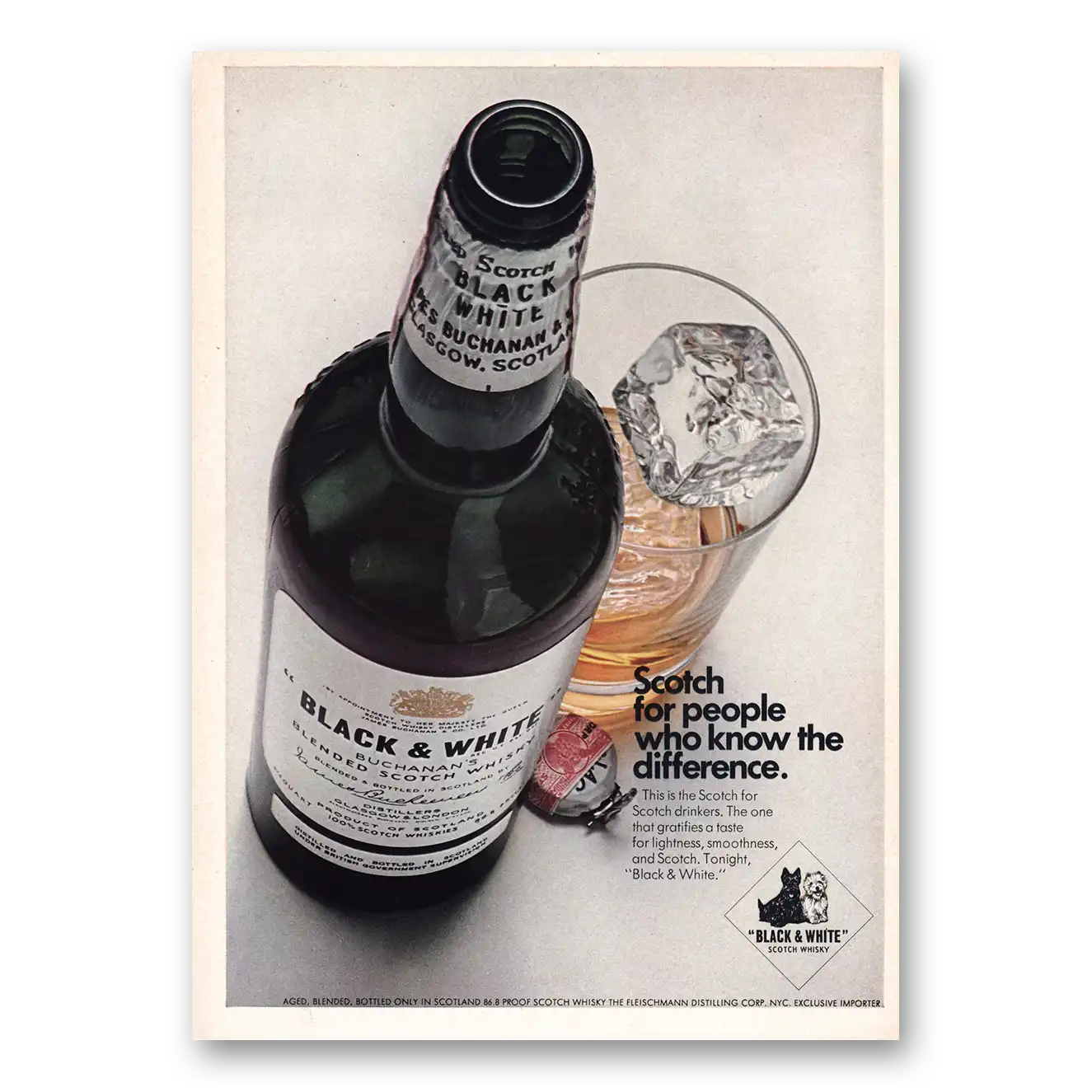 This is an original 1968 Black and White Scotch print ad published by Black and White Scotch.