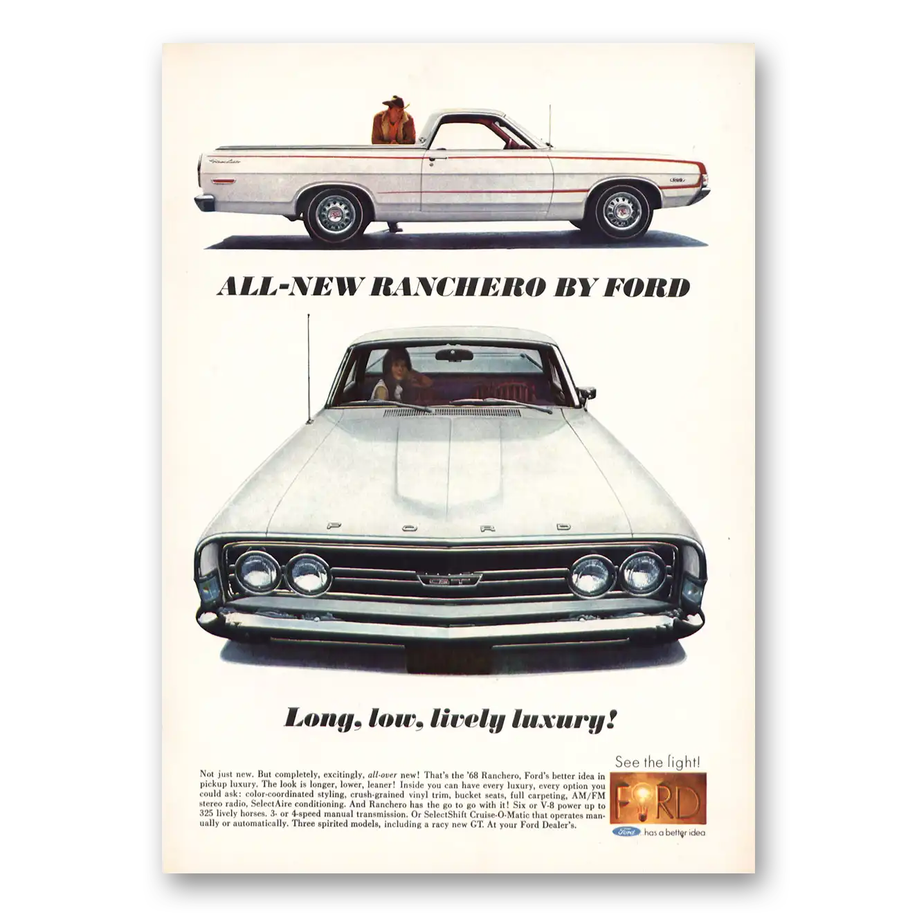 1968 Ford Ranchero Print Ad | Long Low Lively Luxury