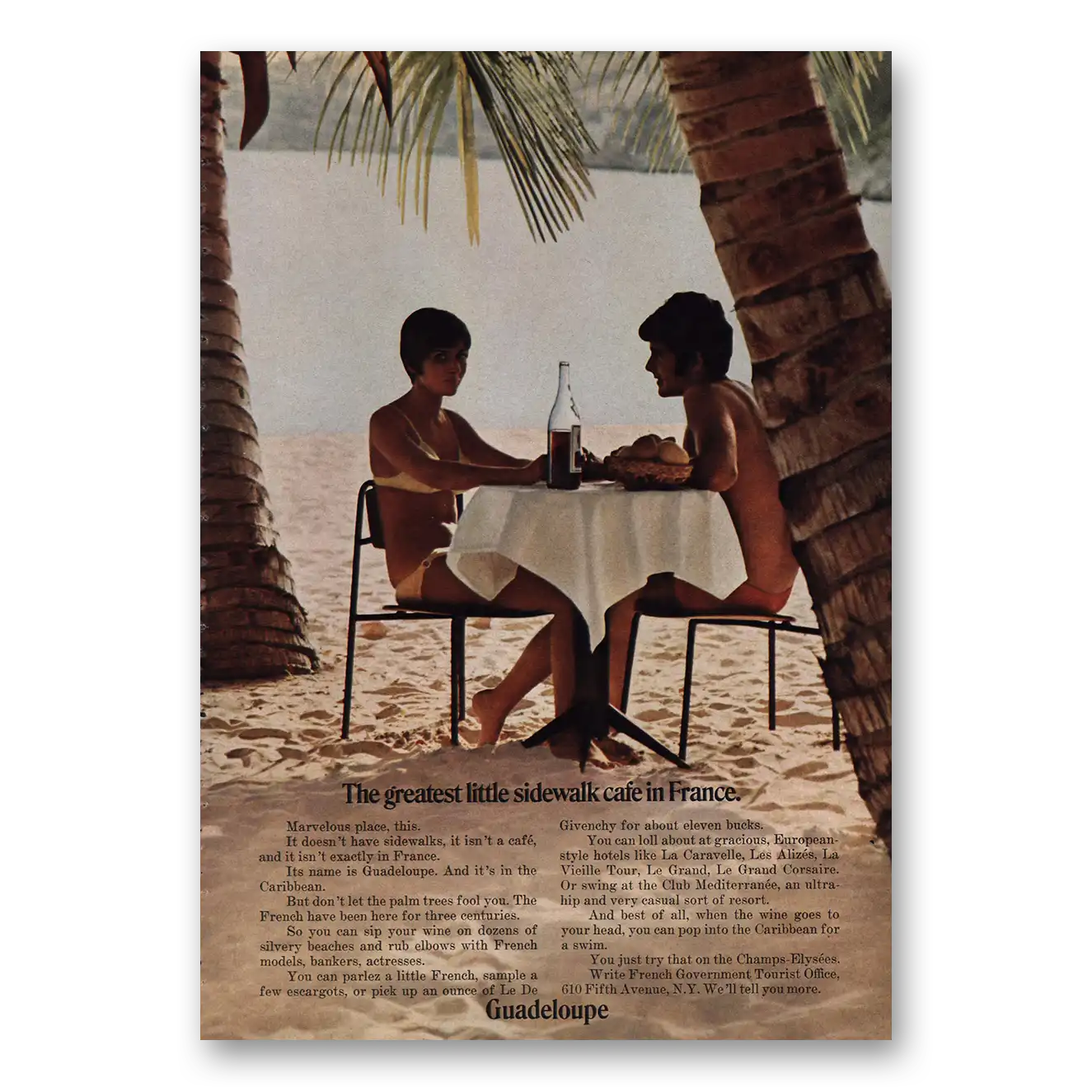 1968 Guadeloupe Print Ad | Greatest Little Sidewalk Cafe In France