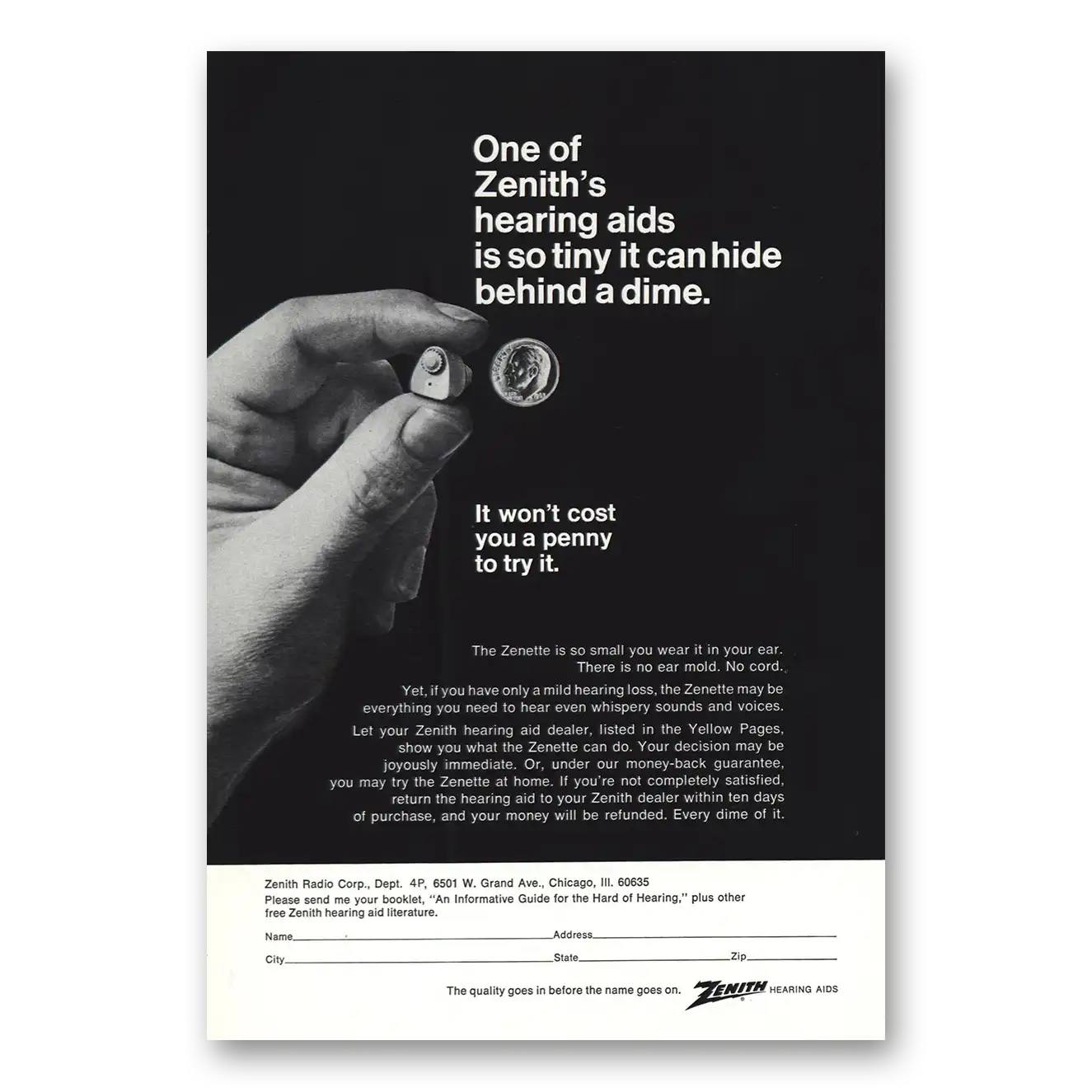 1968 Zenith Hearing Aid Print Ad | So Tiny It Can Hide Behind Dime1968 Zenith Hearing Aid Print Ad | So Tiny It Can Hide Behind Dime
