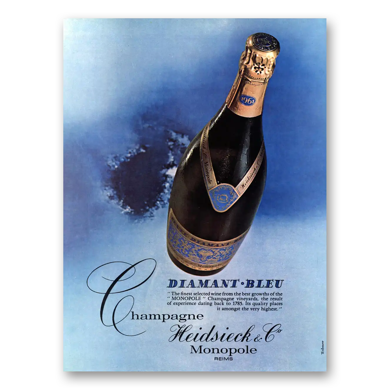 This is an original 1969 Diamant Bleu Wine print ad published by Monopole Champagne.