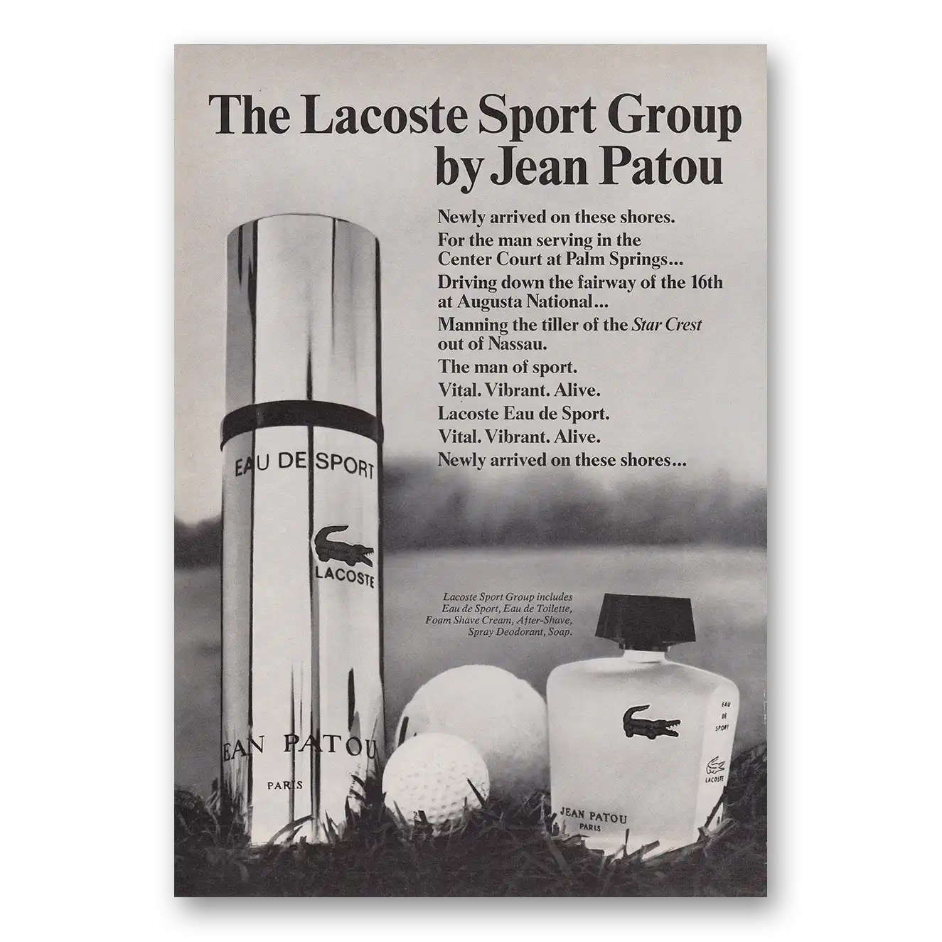 This is an original 1969 Lacoste Sport Group print ad published by Jean Patou.