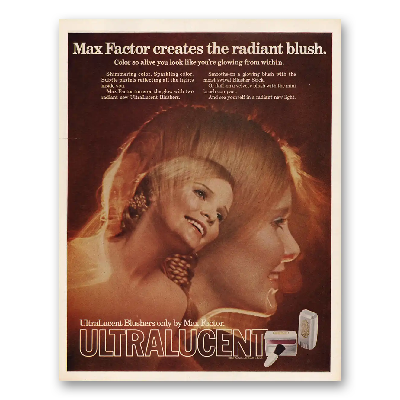 This is an original 1969 Max Factor Ultralucent Blush print ad published by Max Factor.