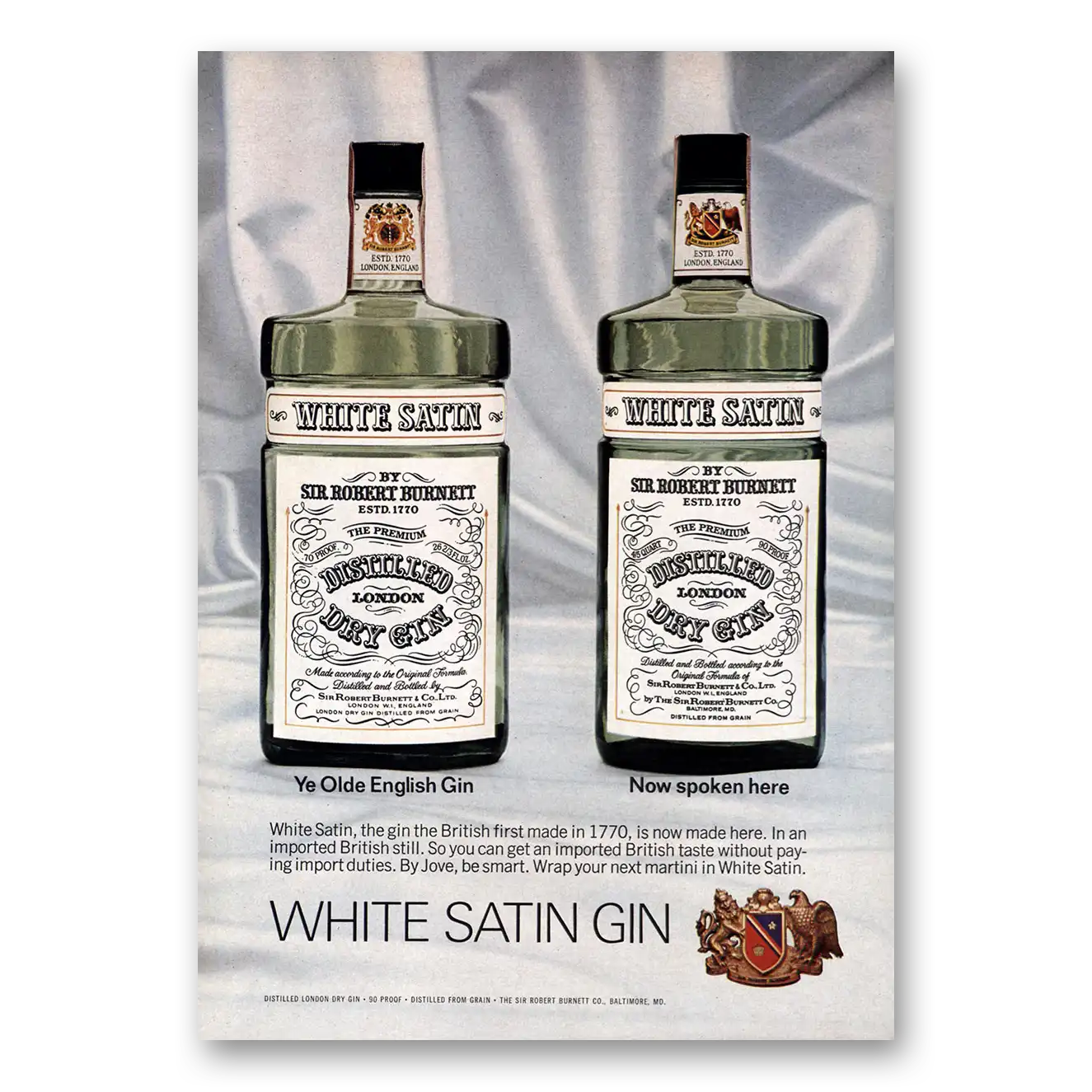 This is an original 1969 White Satin Gin print ad published by Sir Robert Burnett.
