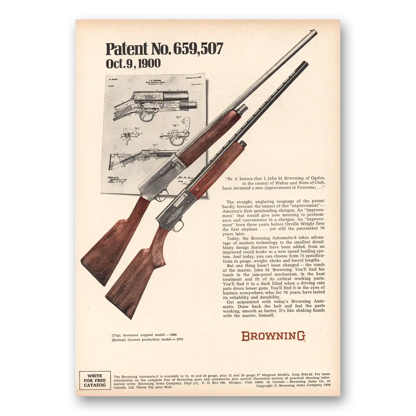 1970 Browning Arms Print Ad | Patent No