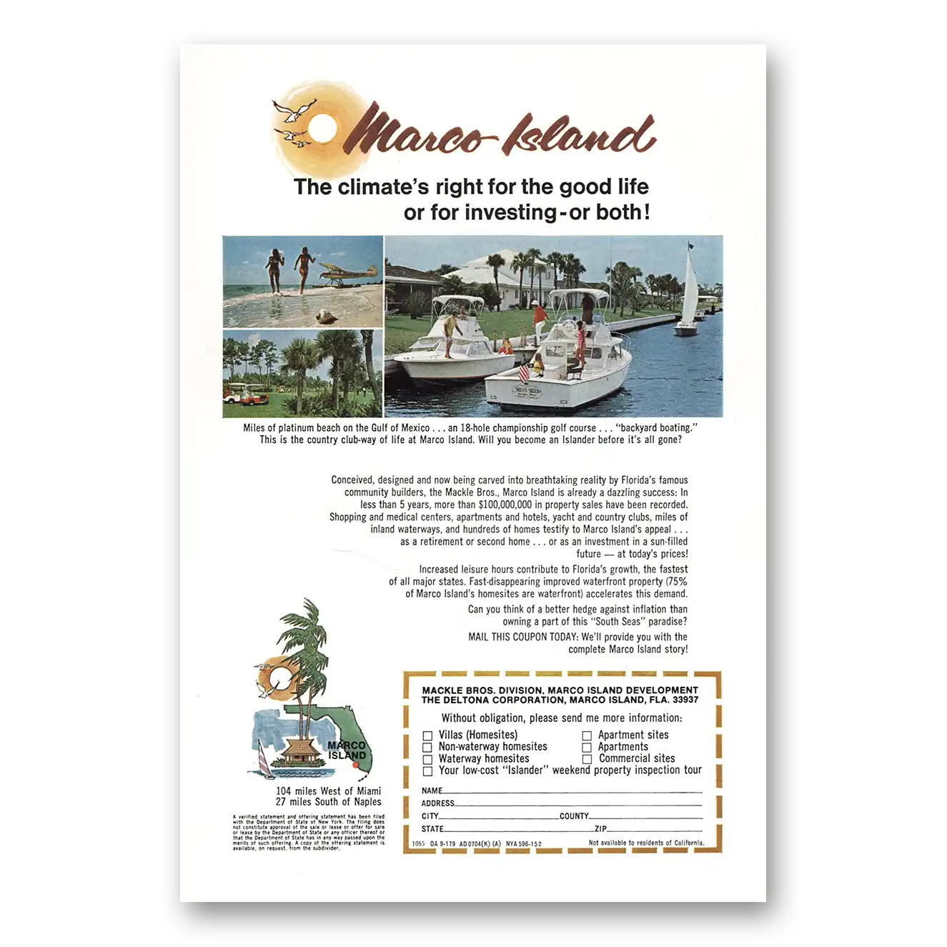 This is an original 1970 Marco Island Florida print ad published by Mackle Bros.