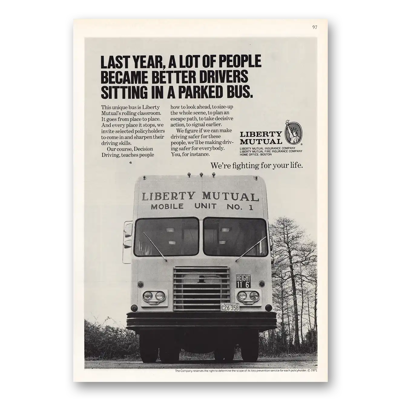 1971 Liberty Mutual Insurance Print Ad | Parked Bus