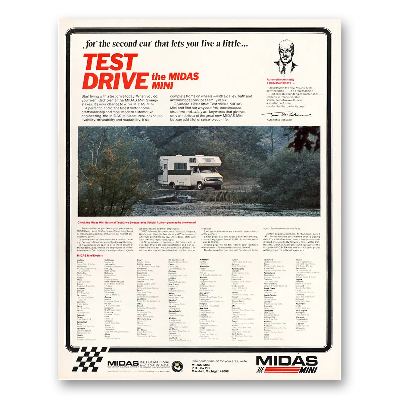 This is an original 1972 Midas Mini Motor Home print ad published by Midas International.