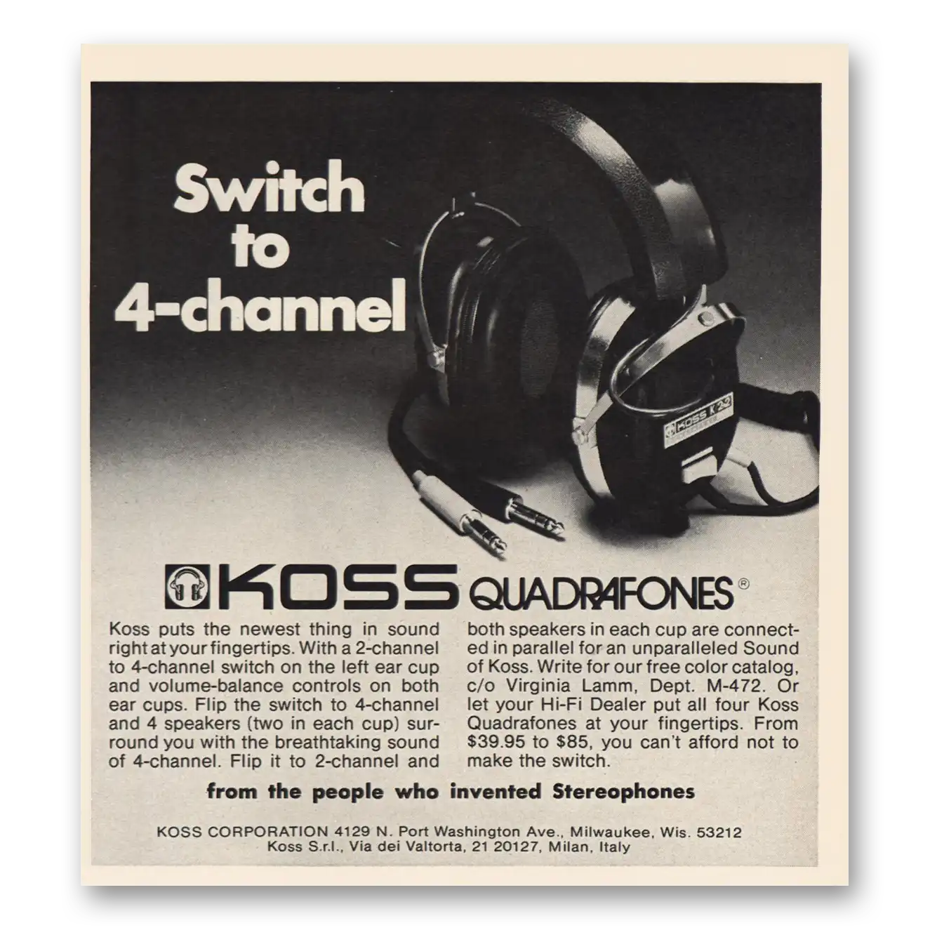 1973 Koss Stereophones Print Ad | Quadrafones Switch To 4 Channel