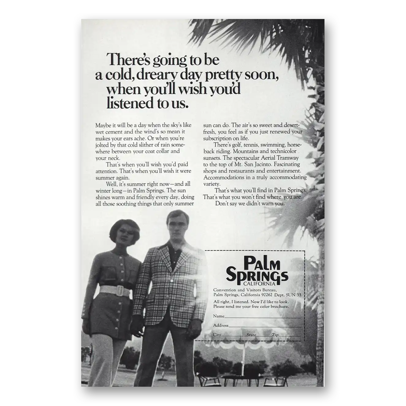 1973 Palm Springs California Print Ad | Cold Dreary Day