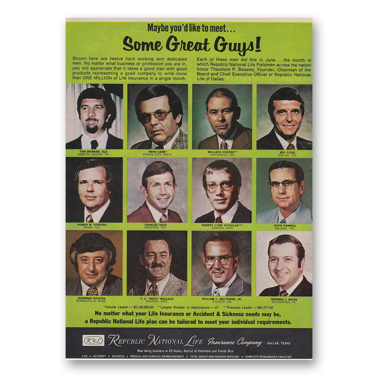 1973 Republic National Life Insurance Print Ad | Great Guys