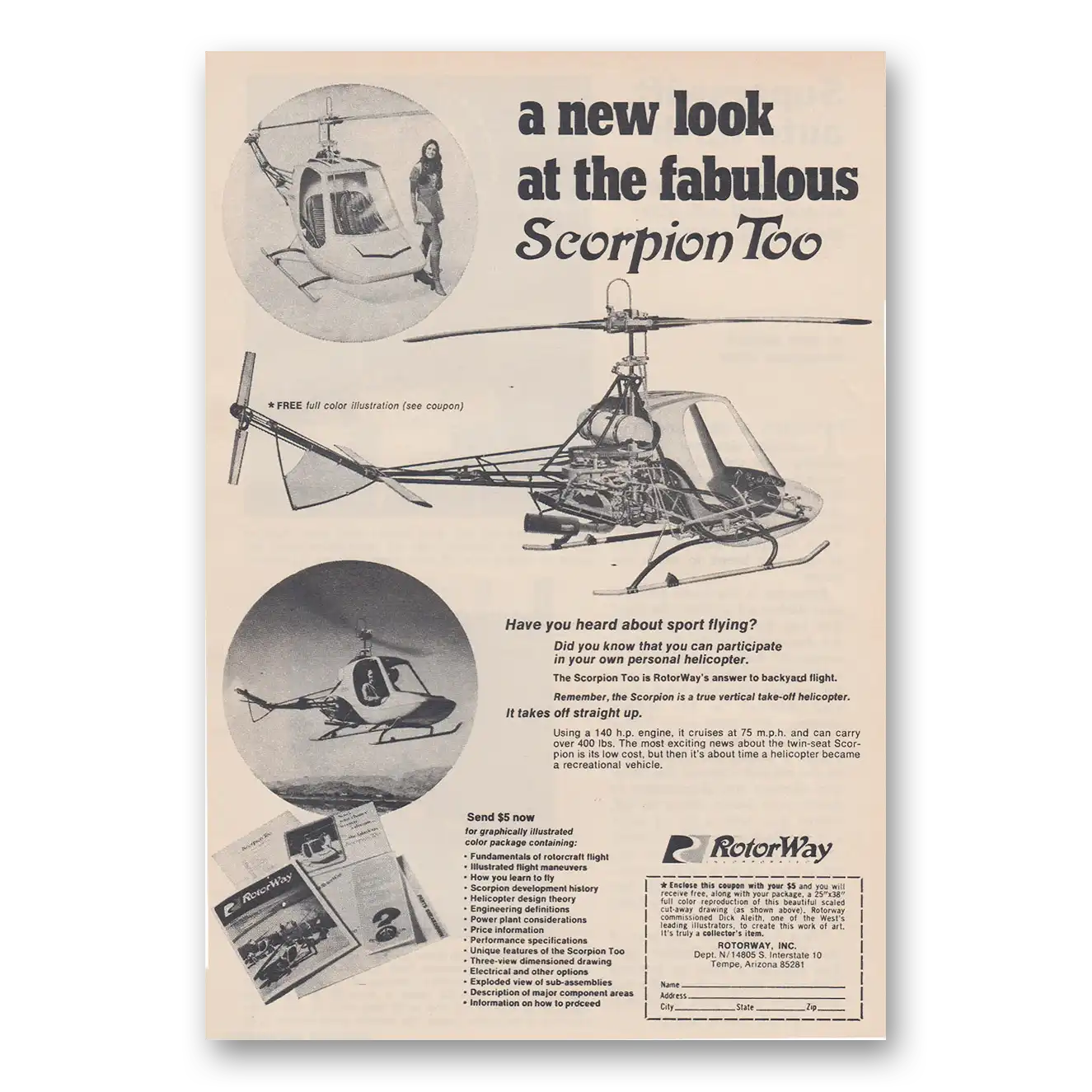 This is an original 1973 Scorpion Too Helicopter print ad published by Rotorway.