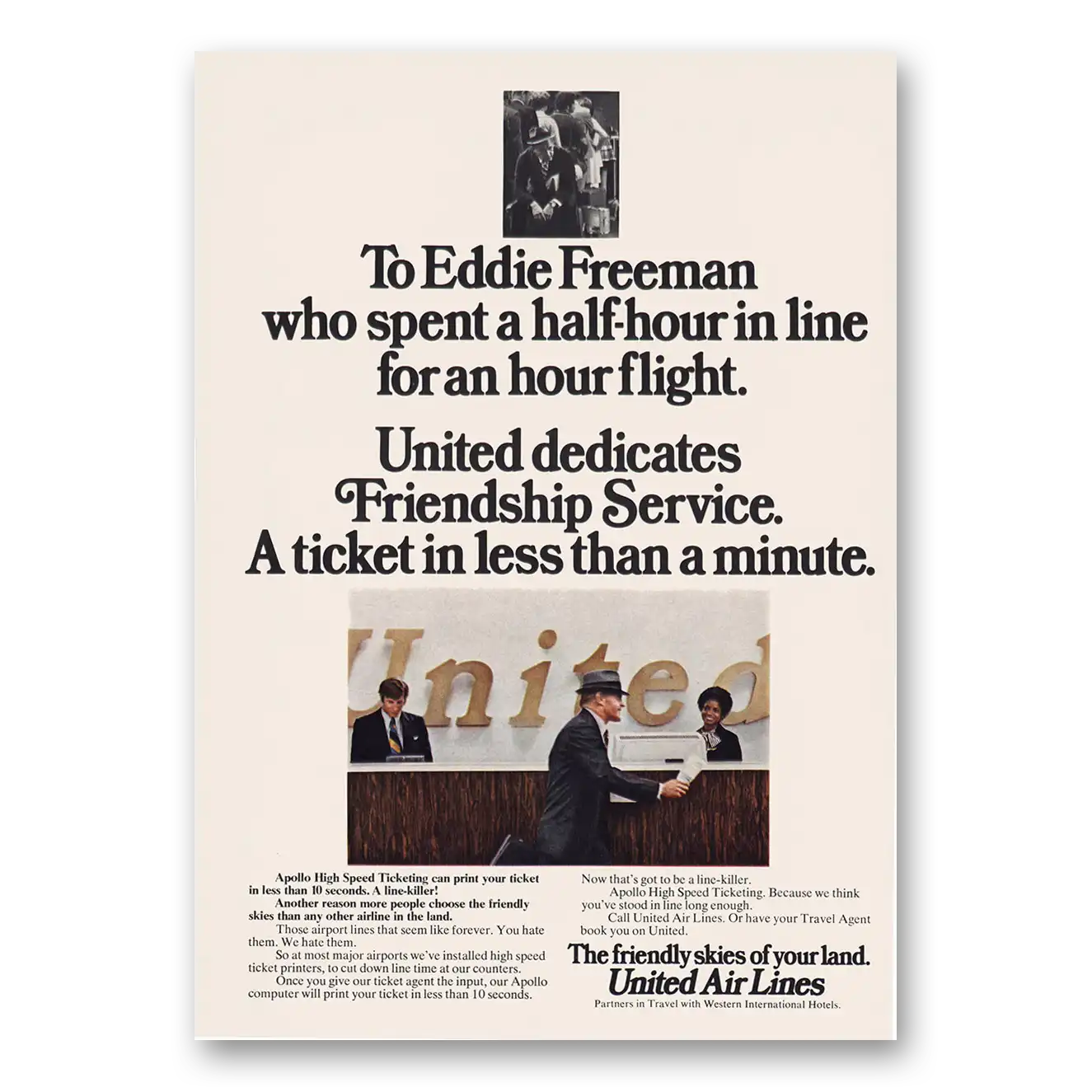 1973 United Airlines Print Ad | Eddie Freeman Friendship Service