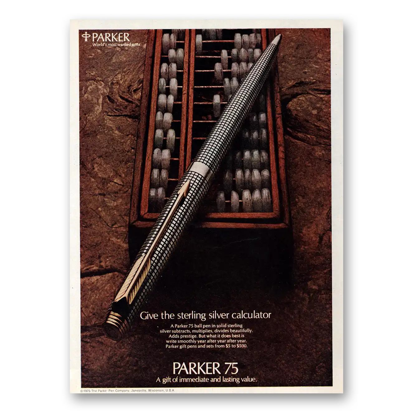 1975 Parker 75 Pen Print Ad | Sterling Silver Calculator