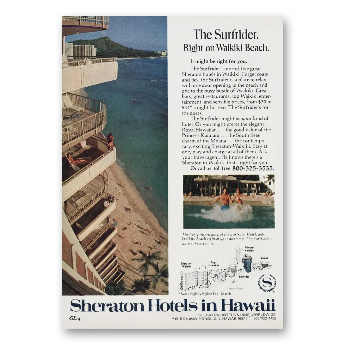 This is an original 1976 Sheraton Surfrider Hotel print ad published by Sheraton Hotels.