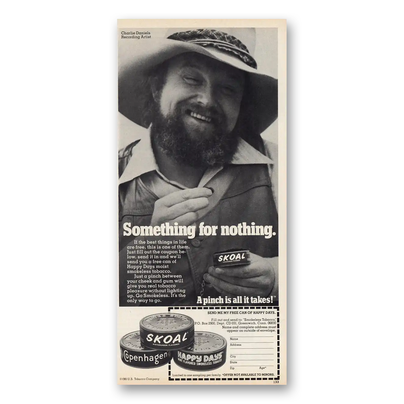 1981 Skoal Smokeless Tobacco Print Ad | Charlie Daniels