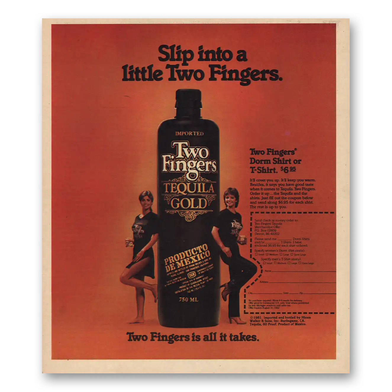 This is an original 1981 Two Fingers Tequila print ad published by Two Fingers Tequila.