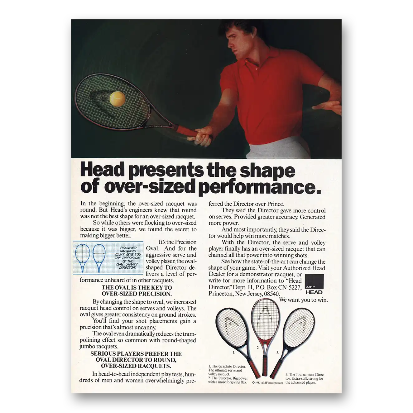 This is an original 1983 Head Tennis Racquet print ad published by AMF.