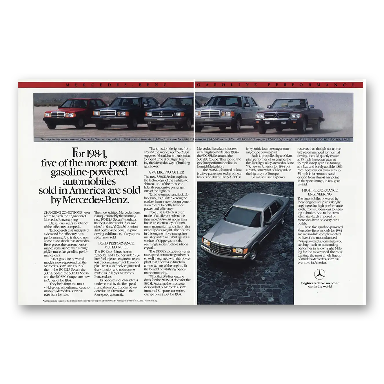 This is an original 1984 Mercedes Benz 500SL print ad published by Mercedes Benz.
