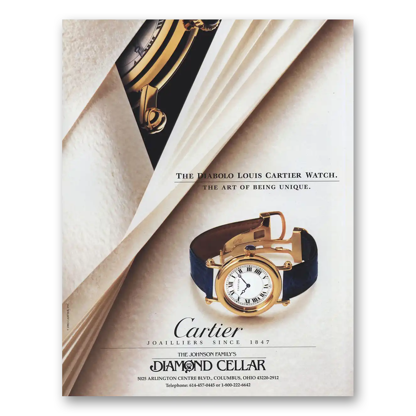 This is an original 1993 Diabolo Louis Cartier Watch print ad published by Diamond Cellar.